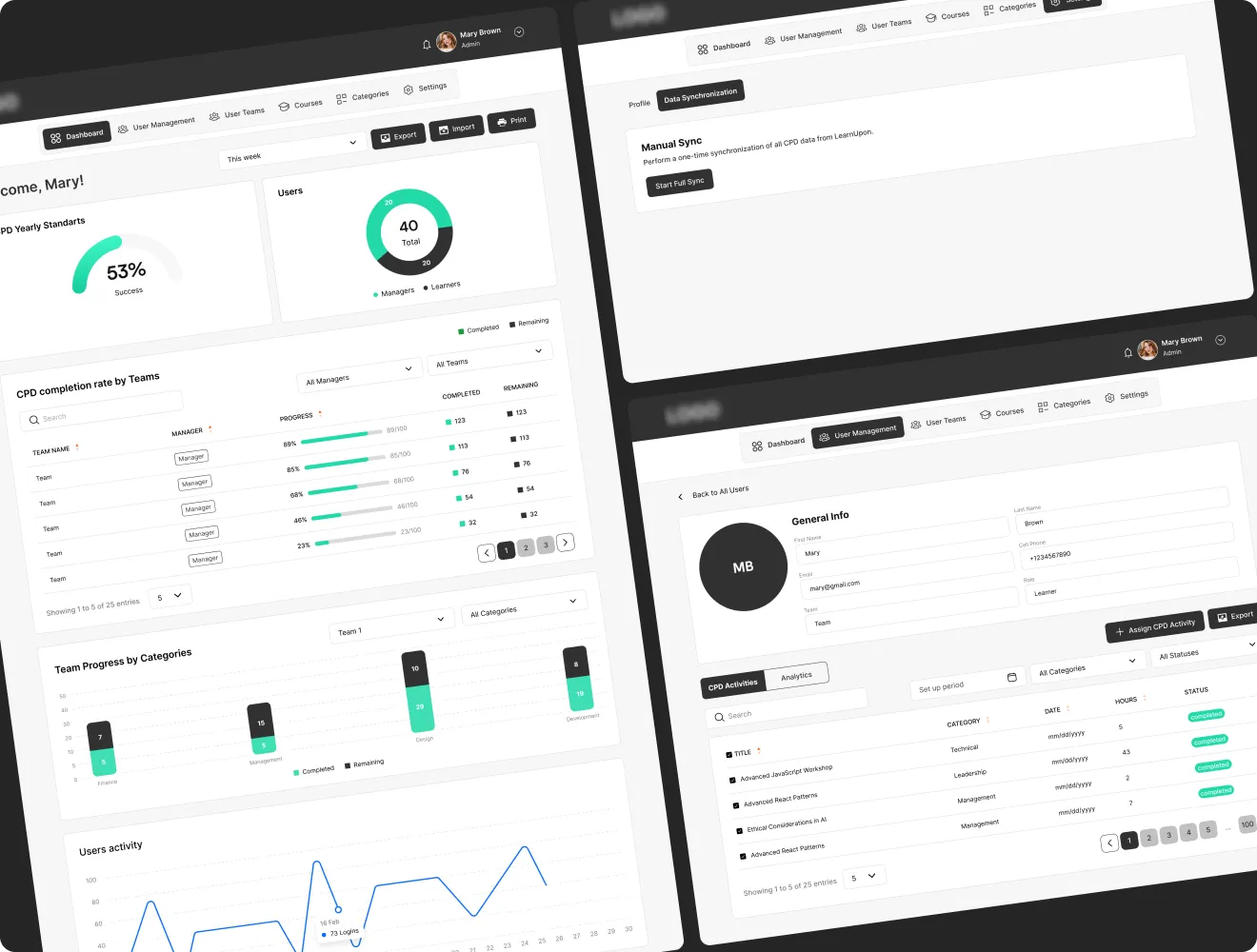 CPD Dashboard is our ready-made system for managing CPD. It is already integrated with LearnUpon and Docebo and can connect to other LMS platforms, too, so you can keep a complete, audit-ready record of all professional training in one place.