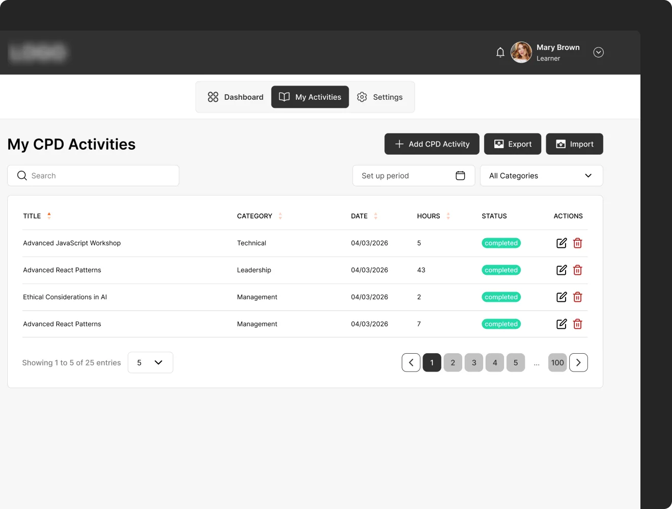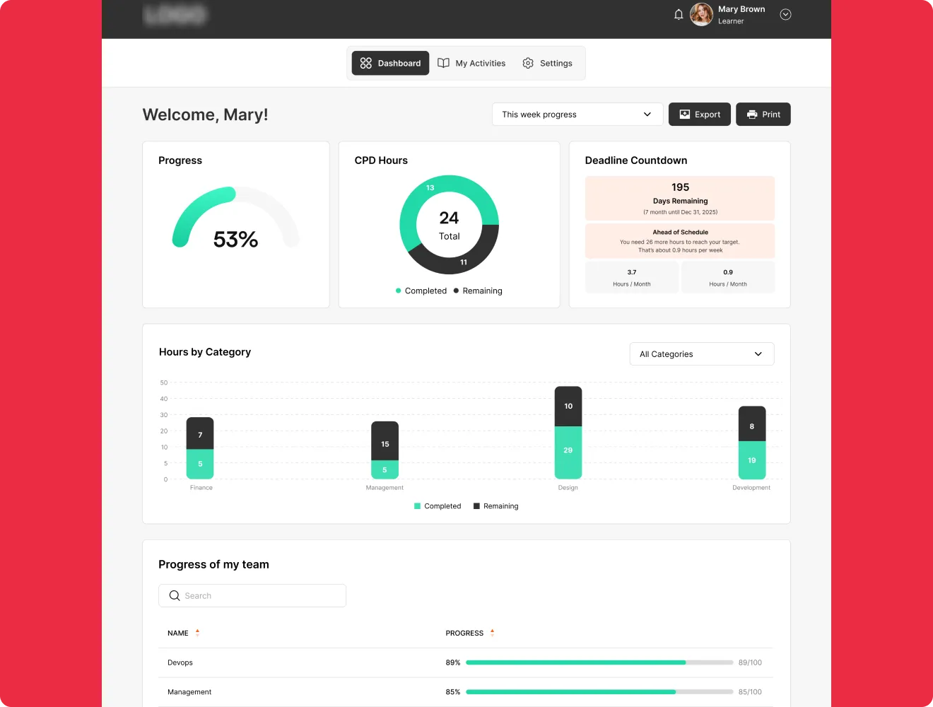 Your LMS tracks courses, but it doesn’t give you a complete continuing professional development record. Our dashboard does. Track hours, categories, external activities, and deadlines on top of your LMS.