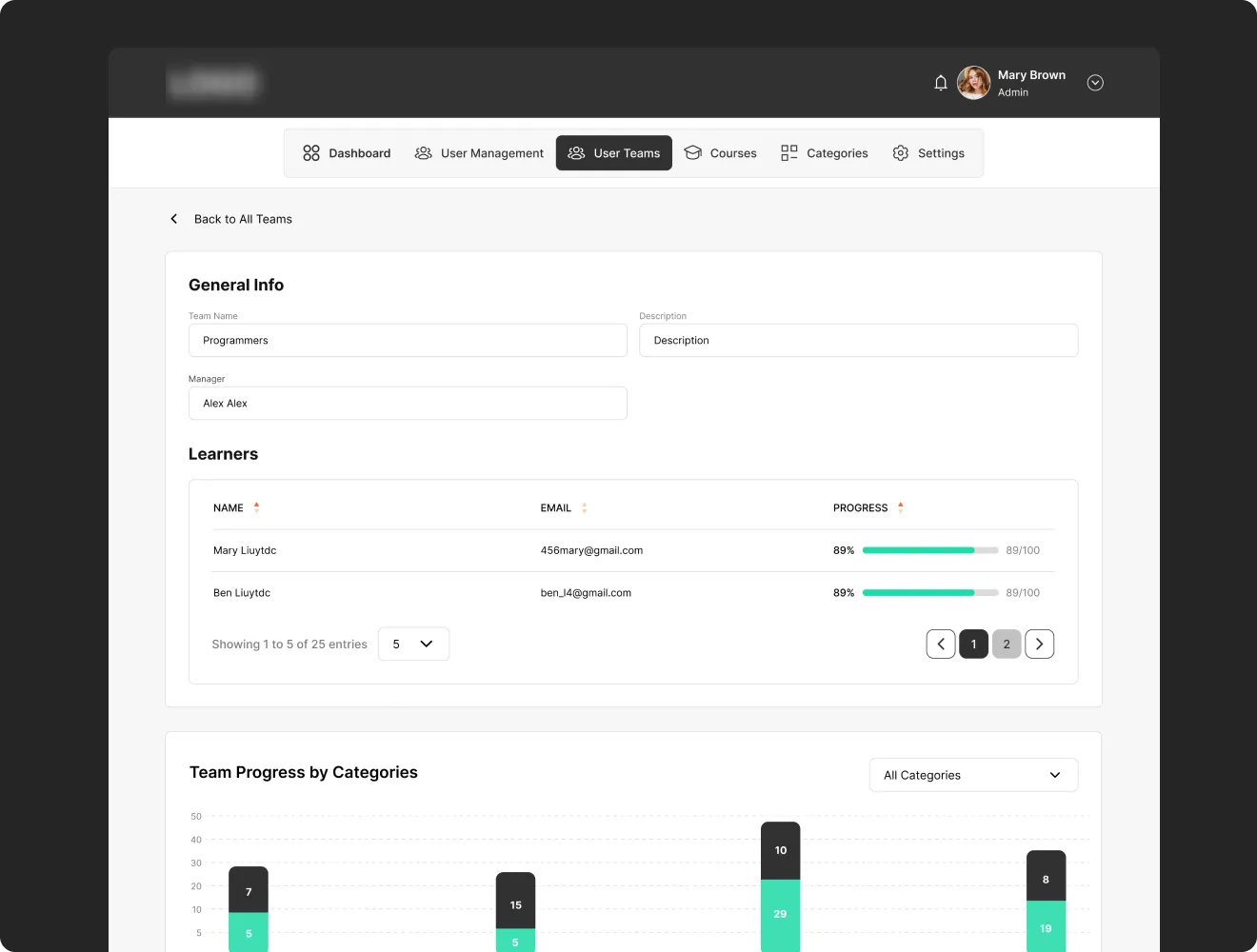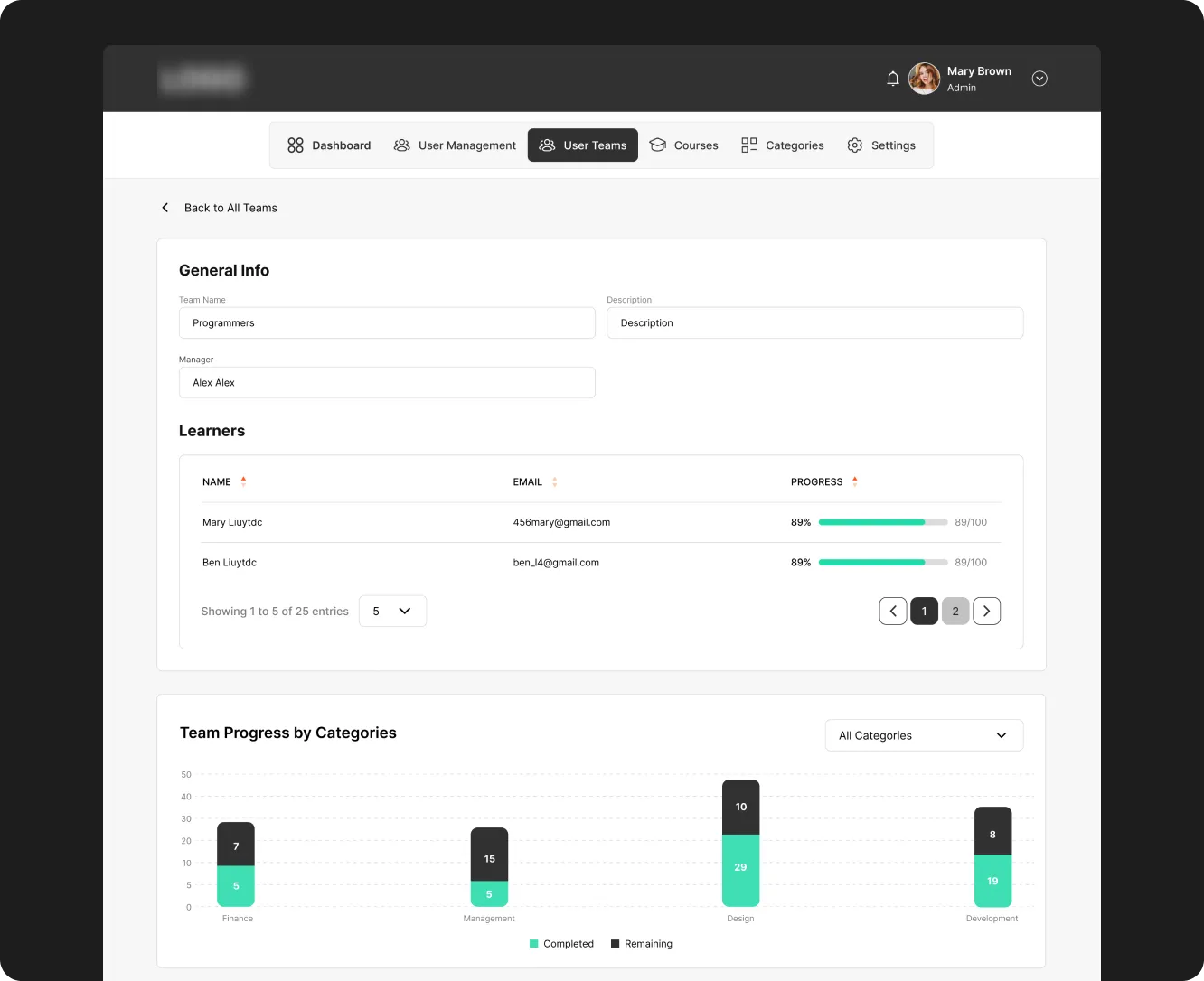 See hours completed, remaining, and time left for every learner on your team.