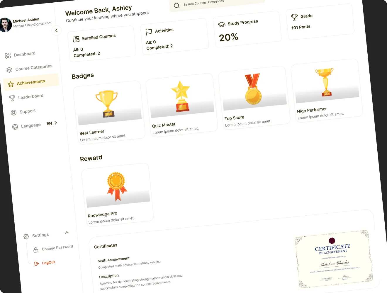 Fully customizable certificates, badges, and rewards can be attached to courses with flexible triggers based on user activities.