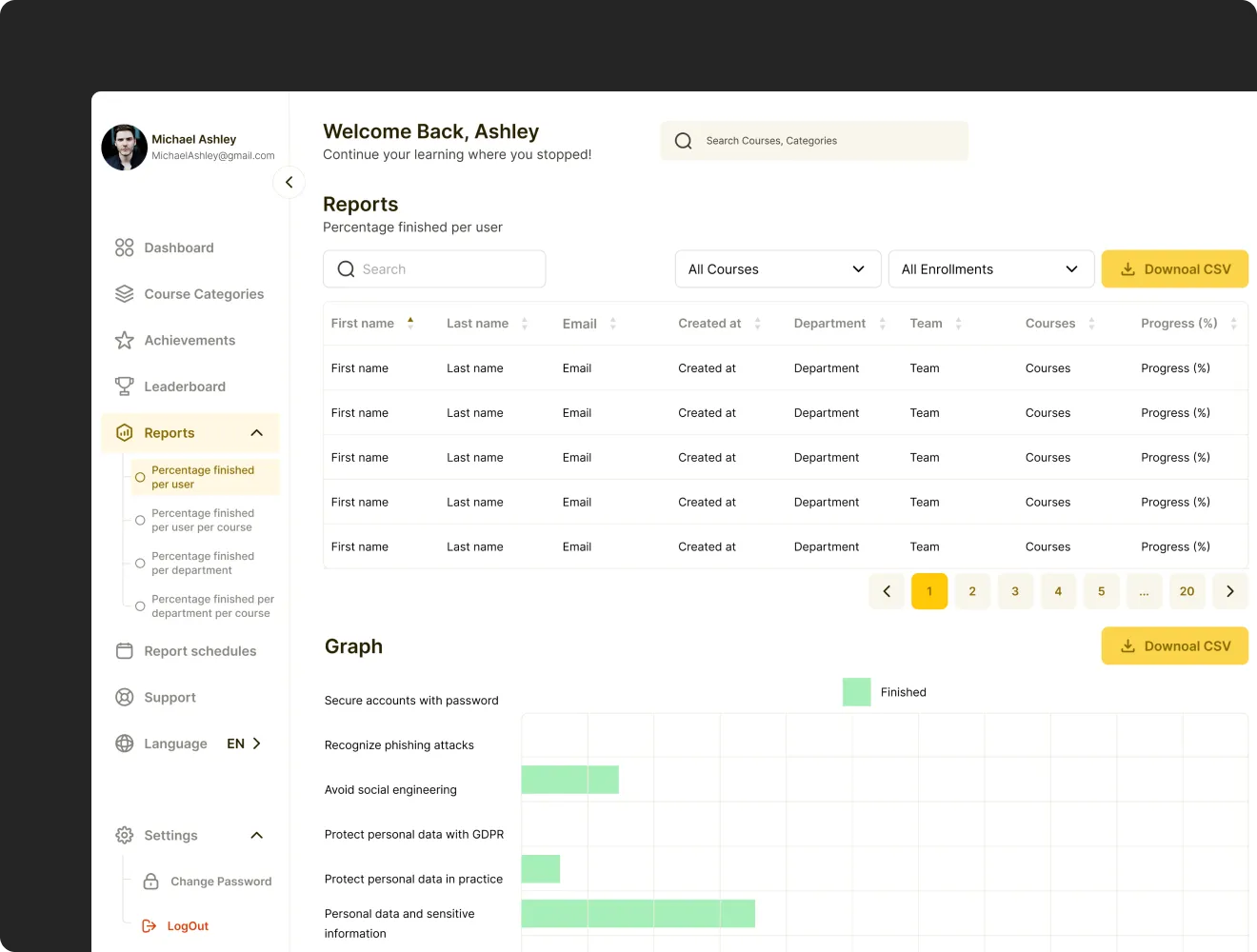 Over 16 report types provide insights by user, department, course, or tenant and can be exported or automatically emailed on a schedule, so managers track results without logging in.